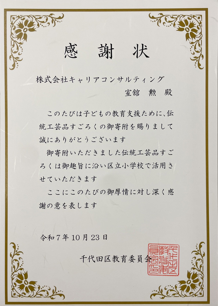 千代田区教育委員会より「わくわく日本!工芸品すごろく」寄付に対し感謝状をいただきました