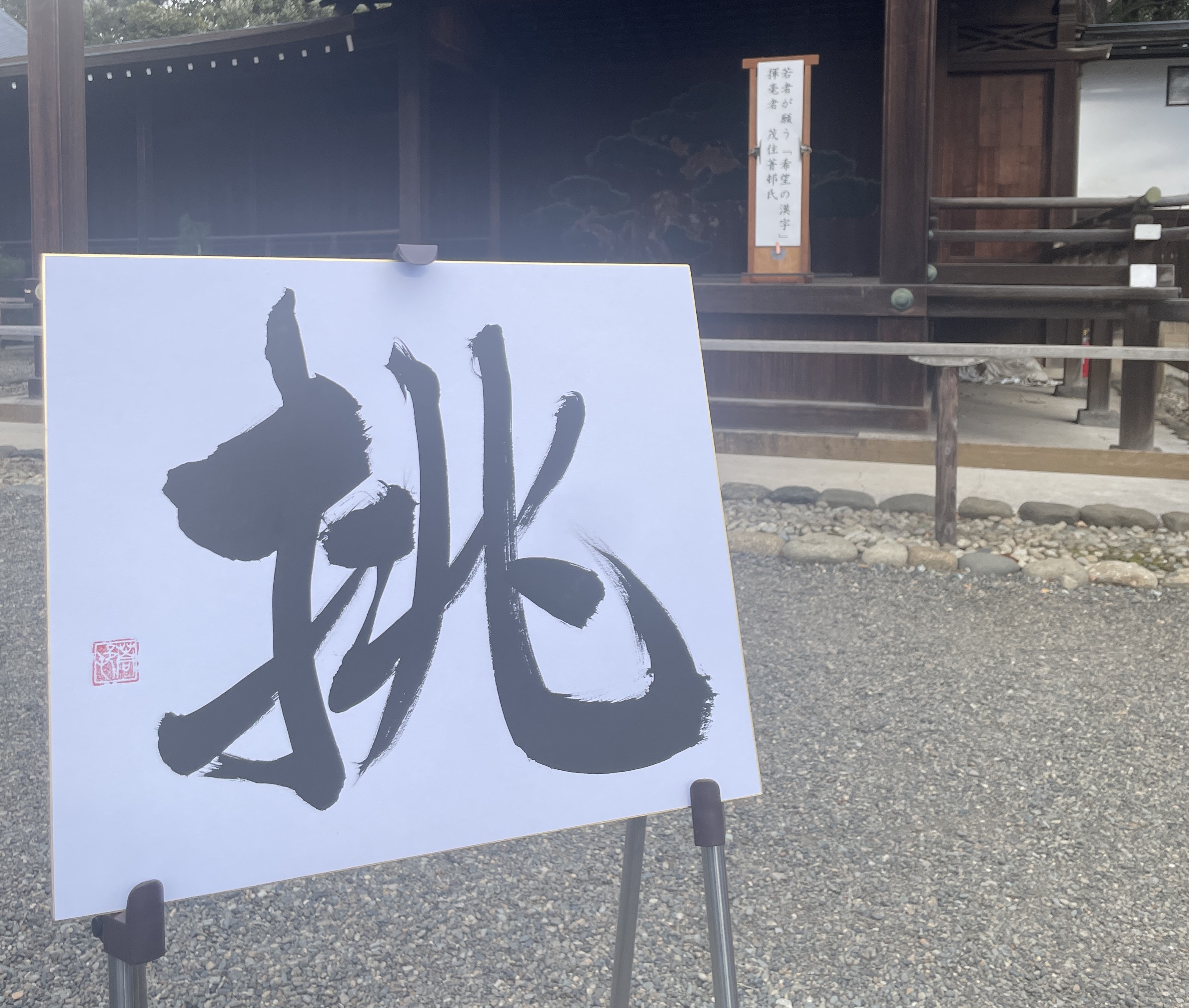 当日は「令和」を揮毫した書家 茂住菁邨氏により、多くの参拝者が見守る中、希望の漢字「挑」が力強く揮毫されました。