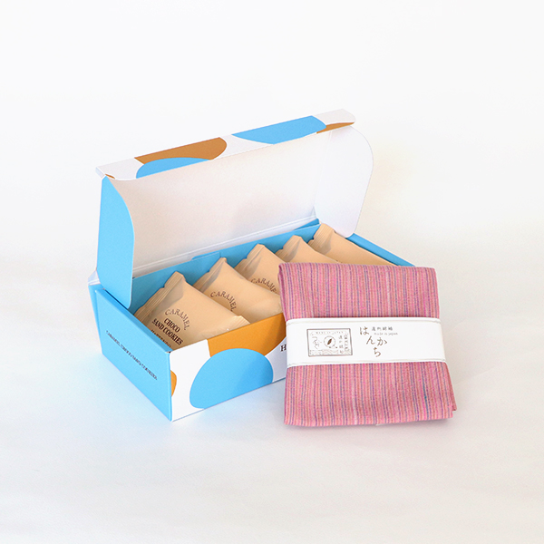 ▼八天堂 キャラメルチョコサンドクッキー + 遠州綿紬はんかち